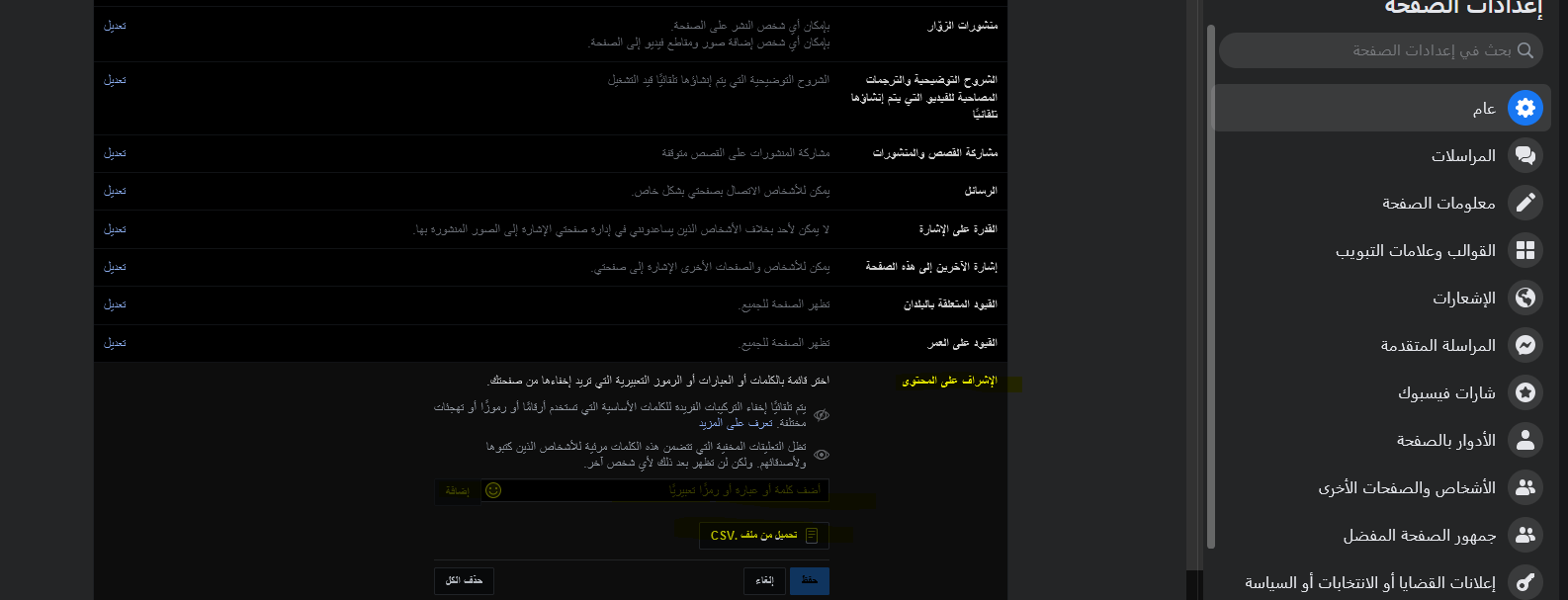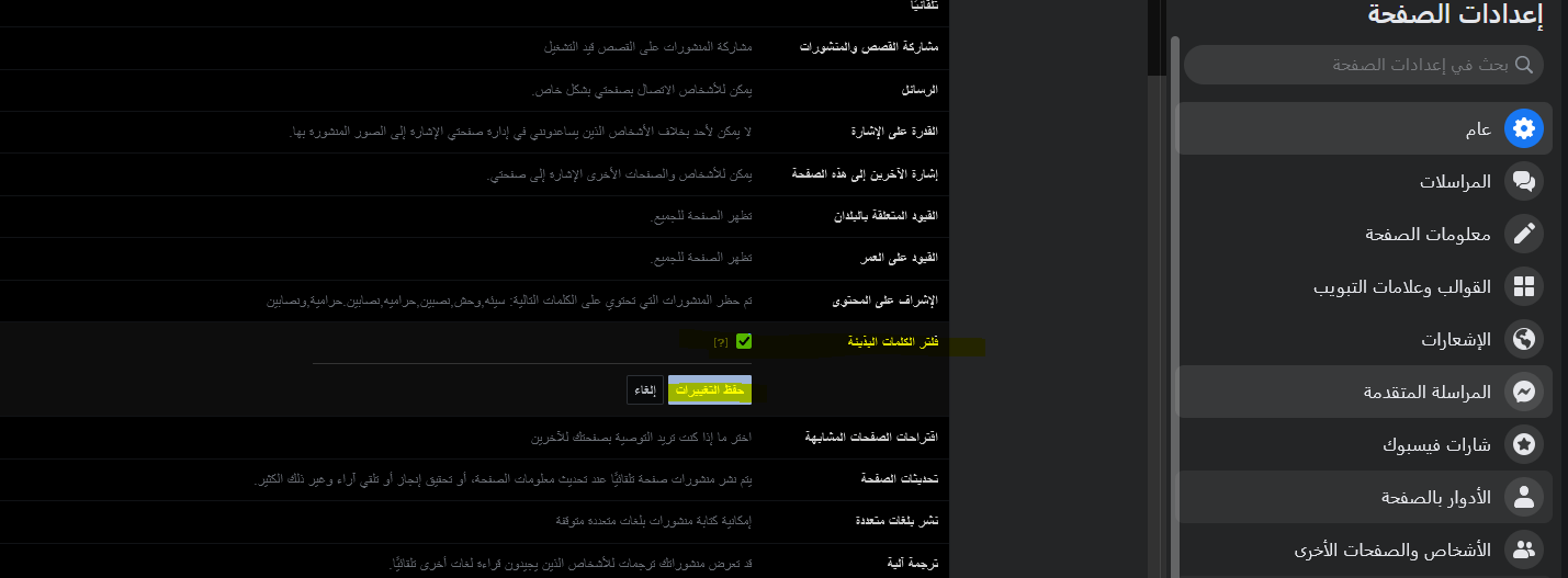 وايضا لاضافة كلمات اخر يمكنك الآن، أضف الكلمات أو العبارات أو حتى الرموز التعبيرية التي تريد إخفاءها من قسم التعليقات في كل منشور. سيتيح لك فيسبوك أيضًا تحميل ملف CSV في حال كانت لديك قائمة طويلة من التعليقات السيئة والكلمات النابية أو حتى الرموز التعبيرية. وعند الانتهاء ، انقر فوق الزر “حفظ التغييرات”