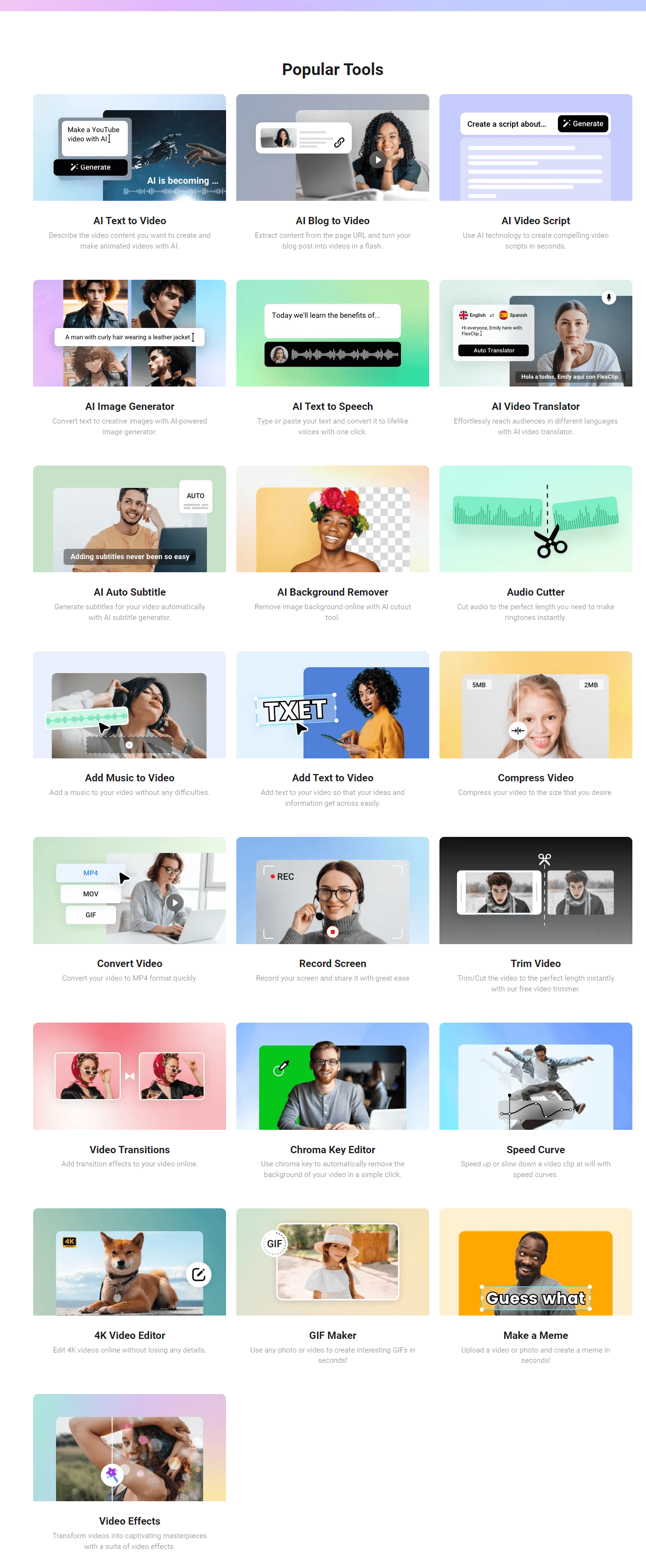 يُقدم FlexClip منصة ويب متكاملة تجمع بين سهولة الاستخدام والقدرات التحريرية القوية، مما يجعله خيارًا مثاليًا للمحترفين والمبتدئين على حد سواء. فيما يلي بعض الميزات البارزة: