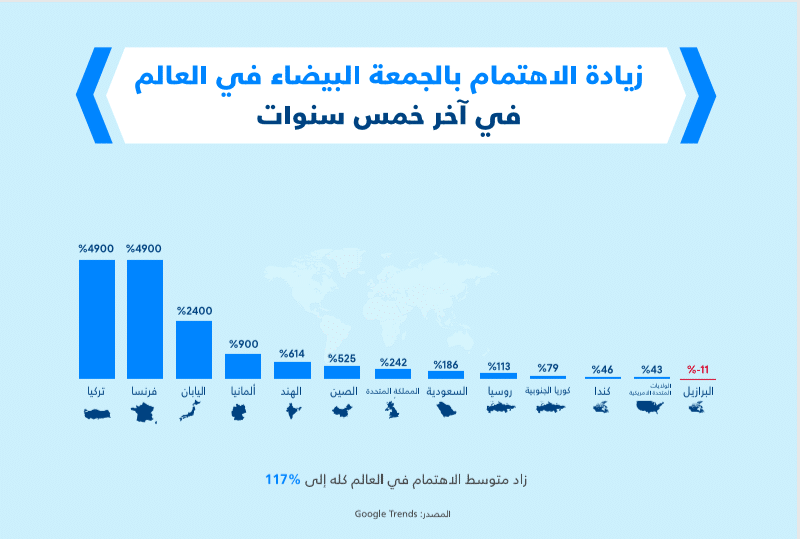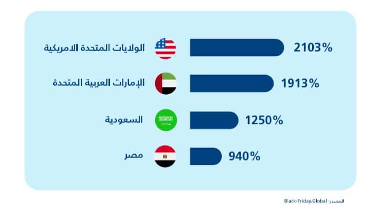 تظهر النتائج أن المبيعات زادت خلال يوم الجمعة البيضاء في العالم كله بنسبة كبيرة مقارنة باليوم العادي في مصر، وعلى حد الخصوص في عام 2018؛ حيث زادت نسبة المبيعات إلى 940٪ مقارنة باليوم العادي. ا، ولكن إذا ما قورن بالزيادة في المبيعات في كل من المملكة العربية السعودية والإمارات ًيبدو الرقم كبير العربية المتحدة، حيث بلغت 1250% في السعودية، ووصلت إلى 1913% في الإمارات، فإنها تبدو متوسطة. أما في الولايات المتحدة الأمريكية، فإن الزيادة وصلت إلى 2103%؛ نسبة أكبر بكثير من الدول ا. لذلك، تعتبر ًالثلاث السابقة. ويقدر المتوسط العالمي للزيادة في المبيعات إلى 624%، نسبة كبيرة جد الجمعة البيضاء من أهم مواسم المبيعات في العالم.