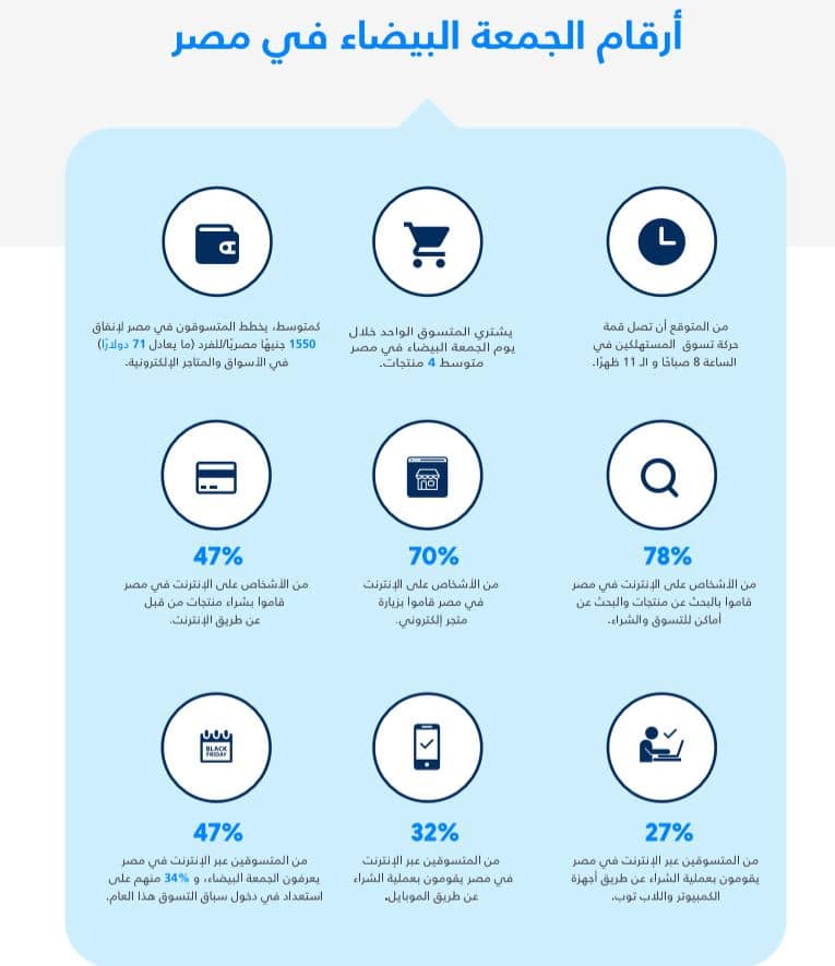 يستعد المتسوقون في مصر للإنفاق على التسوق في كل ا لكل ًمن المتاجر العادية والمتاجر الإلكترونية إلى 1550 جنيه ا خلال الجمعة البيضاء، ًفرد كمتوسط، أي ما يعادل 71 دولار ويصل حجم الإنفاق في المملكة العربية السعودية خلال الجمعة البيضاء إلى 286 دولار، كما يصل حجم الإنفاق للفرد في الولايات المتحدة الأمريكية إلى 515 دولار.