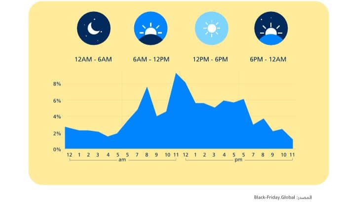 من الملاحظ من السنوات السابقة بأن الأشخاص في مصر يقومون بالتسوق منذ الساعة ال 11 مساء ا في يوم الجمعة البيضاء؛ وفي 8102 في مصر، تواصل إقبال المستهلكين على ًوحتى ال 11 صباح ا حتى ًالشراء بخصومات كبيرة خلال يوم الجمعة البيضاء، حيث وصلت ذروة نشاطهم في الساعة ال 8 صباح ال 6 في المغرب. حدث هذا لأن يوم الجمعة هو يوم عطلة نهاية الأسبوع الرسمية في مصر وبعض من البلدان العربية، على عكس دول أخرى.