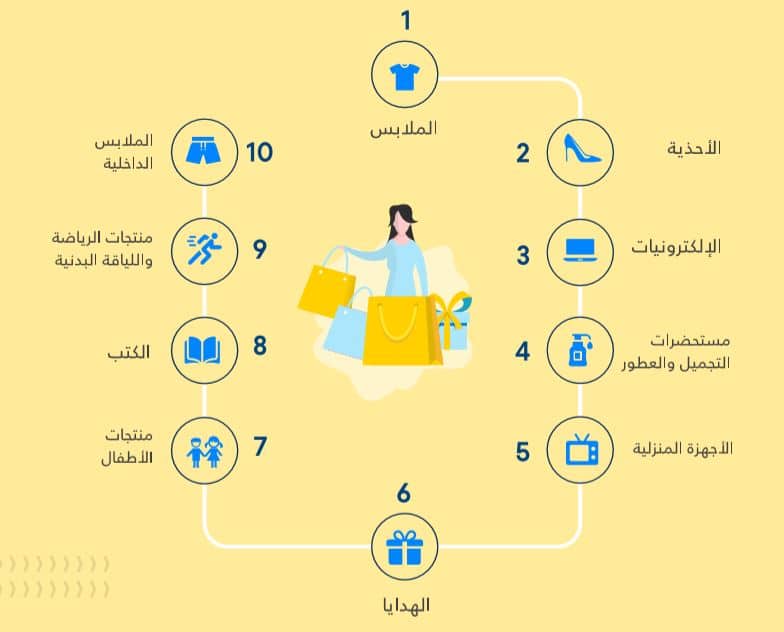 كمتوسط ، فإن الشراء خلال يوم الجمعة البيضاء في مصر يصل إلى 4 منتجات للشخص الواحد. وتتصدر ، تليها الأحذية والإلكترونيات، ًالملابس من قطاع الموضة والأزياء القائمة، حيث أنها من أكثر المنتجات شراء ثم مستحضرات التجميل، والعطور، والهدايا.