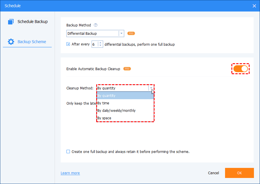 - Scheme (مخطط): لإدارة مساحة التخزين عن طريق حذف النسخ الاحتياطية القديمة.